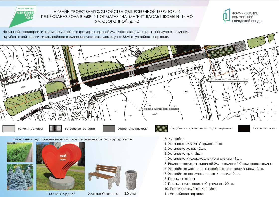 Пешеходная зона в мкр. Г-1 от магазина «Магнит» вдоль школы № 14 до ул. Оборонной, д. 42