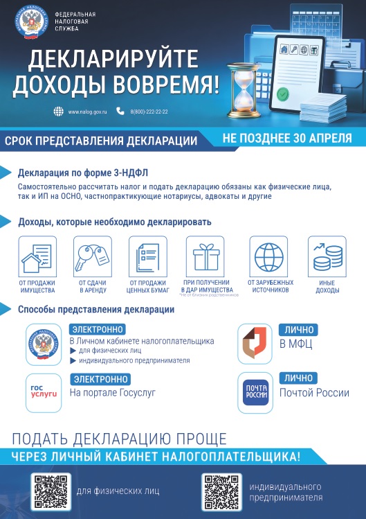 Представить декларацию о доходах, полученных в 2025 году, необходимо до 30 апреля 2026 года.