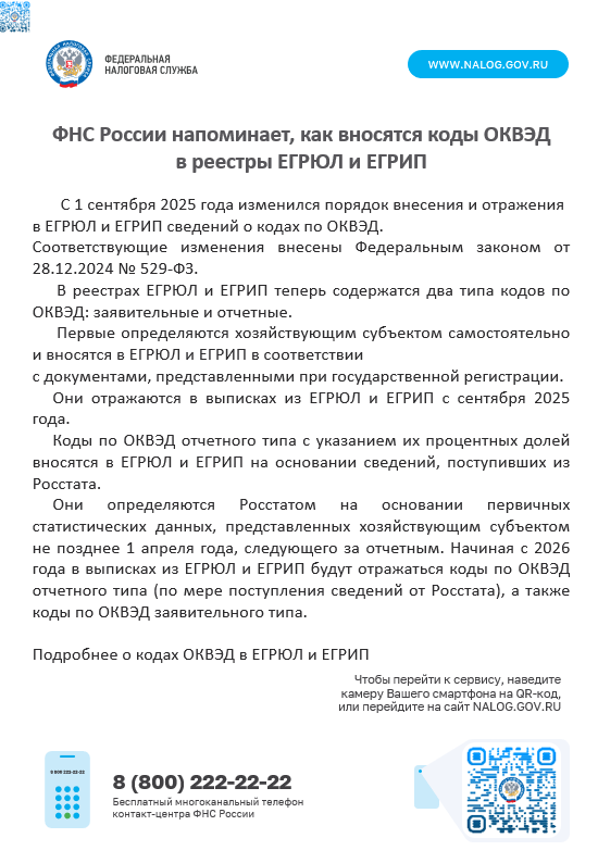 ФНС России напоминает, как вносятся коды ОКВЭД в реестры ЕГРЮЛ и ЕГРИП